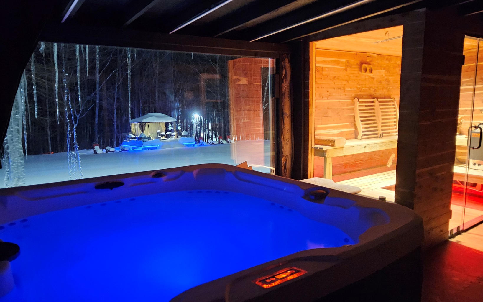 Private hot tub and massage chairs for 2 people...